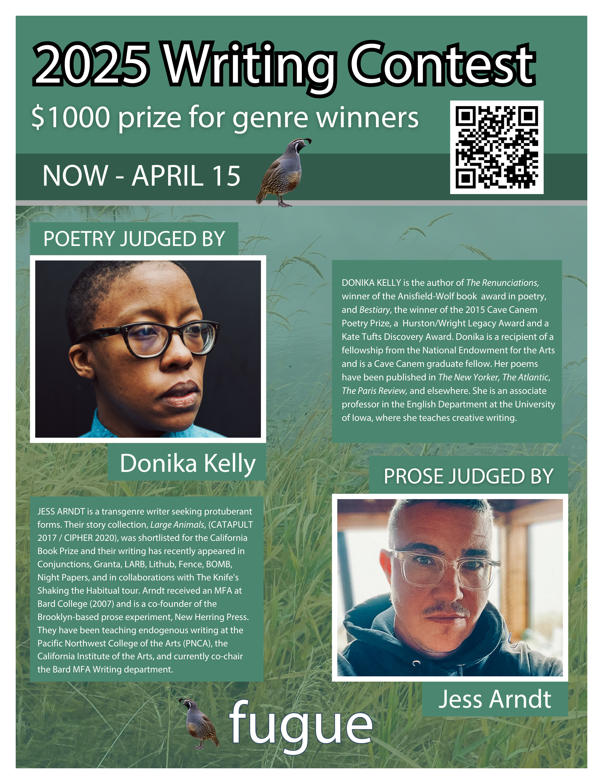 Fugue is excited to announce our 2025 Annual Writing Contests! This year’s judges are Jess Arndt (prose) and Donika Kelly (poetry).
